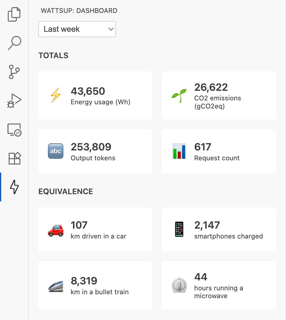 Wattsup for Github CopilotTrack the energy footprint of every Copilot assistant suggestions, right inside VS Code.Now available on Github